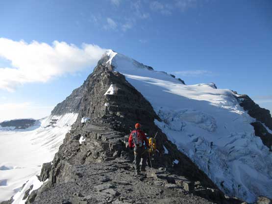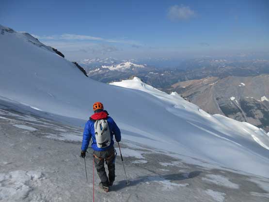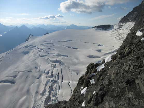 The next section was a pleasant surprise as we walked across the top of the north ridge’s west spur. The ridge crest was very broad and pretty much flat and we got to see the impressive north glacier up-close. There is one steep step requiring 3rd class climbing on loose rock but elsewhere was nice and easy. Towards the “headwall” feature I opted to put crampons on and ascend on snow while Jeff and Lyle decided to stay on rock. In terms of efficiency I think we were the same. To gain the North Ridge proper we had to find a way up the headwall. We all had some concerns about this section but it turned out to be nothing harder than 3rd-4th class. The hardest step was a wet, down-sloping corner (4th class) near the bottom and the exposure was quite mild the whole way.