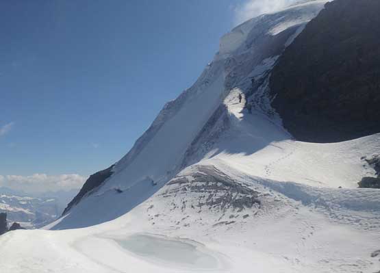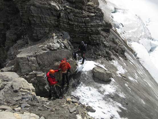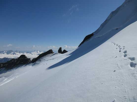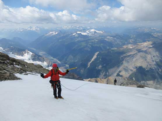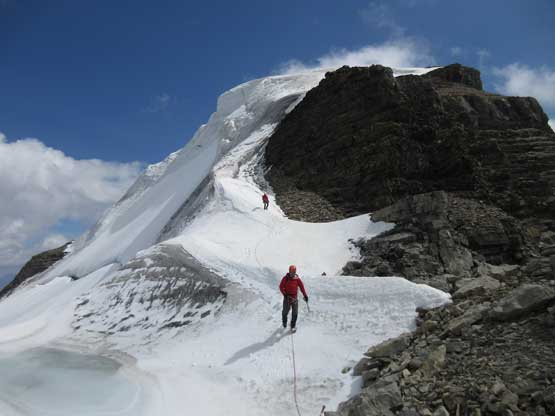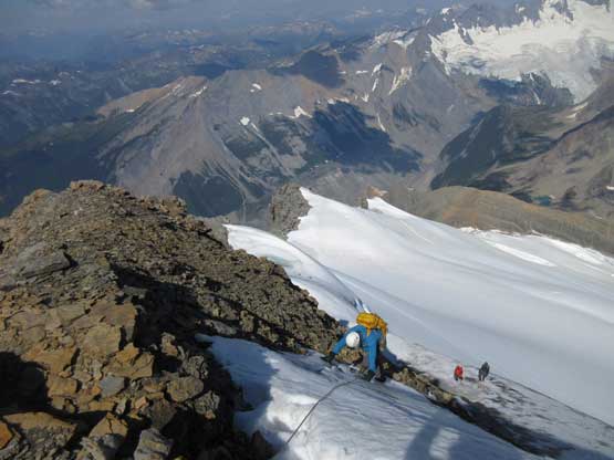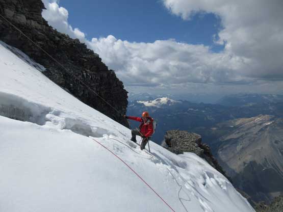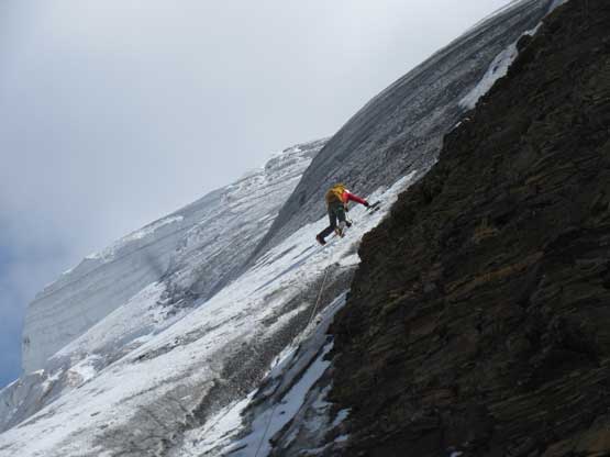 What seemed like a tame glacier from below turned out having quite a few crevasses especially on the near side so we played cautiously and roped up. Meanwhile this highest notch on the north ridge provided a natural platform to take a lengthy break. I believe we stopped there for at least half an hour and this allowed Robb and Raff to catch up. They had rapped off that big boulder onto the lower glacier and meanwhile we just started the horizontal traverse over towards the uppermost west ridge. The crevasses on the near side were indeed troublesome and the snow bridges were too soft to trust. Eventually after trying around Jeff picked a questionable bridge and went for it. It held for Jeff and Lyle but I put one leg into the hole on the 3rd crossing. Crossing the bergschrund on the far side (near west ridge) also had some questionable snow bridges that required a lot of probing to trust. To gain the west ridge we had to climb a pitch of steep ice right off the bat. Jeff made it look easy and belayed the two of us up. Meanwhile Robb and Raff had caught up to the same position and we climbed in more-or-less a group-of-5 for the rest of this ascent.