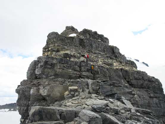 Gaining the north ridge proper was one of the highlights on this ascent – superb and aesthetic position with an exciting ridge ahead of us. Much of the next stage reminded me the upper mountain on Mt. Murchison but at least 2 times longer than Murchison. The rocks are mostly horizontal dinner-plate shale and the scrambling can be broken down into endless series of 3rd-4th class steps. Most of the impassible towers are bypassed on climber’s right (west) side and micro-terrain route-finding played an important role to move efficiently. We did encounter a few climbing steps but I believe all of those could be bypassed, if we looked for that. Wherever “climbing” is required I found the rocks were relatively solid. After what seemed like a long while we reached a shallow notch with a big boulder. It appeared we could have rappelled off that boulder to reach the upper glacier but the decision was to continue scrambling over another tower to the highest point on this north ridge. This was a poor decision because we got ourselves into the least enjoyable terrain of the whole ridge. We made across nonetheless but swore to use the lower notch on the return…