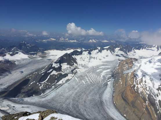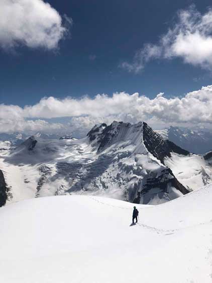Reversing the two steps on the summit ridge wasn’t as hard as we thought and the down-climb of the long 3rd class stretch wasn’t too bad neither. The post-holing had become even worse on the flat sections and before committing to the steeper bypasses we would toss as much rocks down as we could to trigger all of the wet snow. We did trigger at least a few size 2 slides on the tracks we just ascended a few hours earlier so that was quite freaky. It turned out that we didn’t have to step onto steep snow by down-climbing some 4th class choss on the ridge crest. The crux zone required at least three rappels but after three raps using existing stations we were both too tired to down-climb exposed shit. I noticed a chicken head rock on the climber’s right side, checked it and made an anchor to extend our rappel. The 4th rappel got us onto snow. The steep traverse underneath the crux zone wasn’t avoidable and we were glad we didn’t trigger anything there. The grade of the snow under the crux zone wasn’t steep anymore and in another while we were back to Tusk/Irvine col. Despite the tiredness I had to slog up Mt. Irvine because it’s right there. Oakley wasn’t very keen but followed up nonetheless. The views were pretty good and we were both glad we didn’t lazy it out.