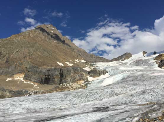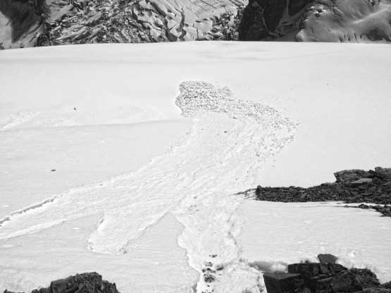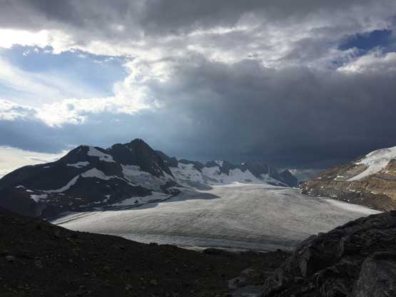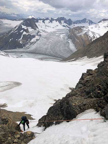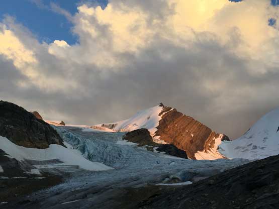 The descent of the couloir underneath Tusk/Irvine col started by some down-scrambling (on crampons), and then two rappels. The first rappel didn’t quite reach the second station with Oakley’s 50 m rope so we had to do a bit of down-climbing. The second rappel got us onto continuous snow and then we had an easy down-climb back to the bergschrund. The roping-up transition was awkward on a sloping slope like this but given the sketchy snow conditions we just had to play it safe. Some of our tracks in the morning had melted out on the glacier such that I had to use GPS to navigate, but for most sections we could just follow our own tracks. Lower down we went a little bit further down on ice before making that horizontal traverse back to our camp, as this avoided a few step-across over open crevasses. We arrived back to camp with a couple hours till sunset so the evening routing was pretty relaxed. That night we got poured on again by thunderstorms and the lightnings were again, seemed close.