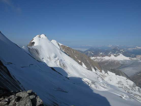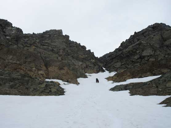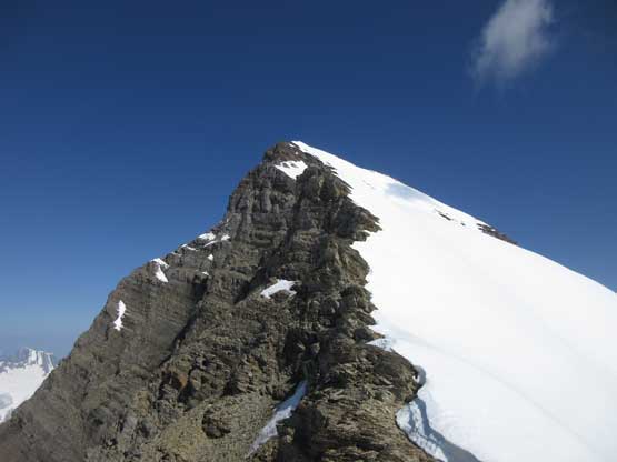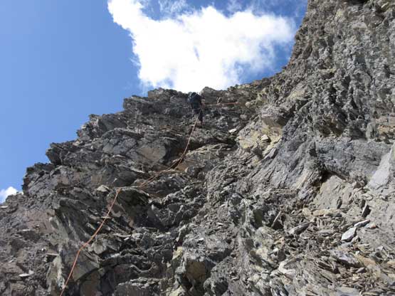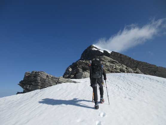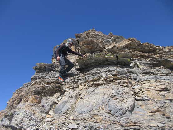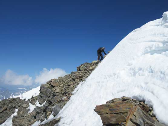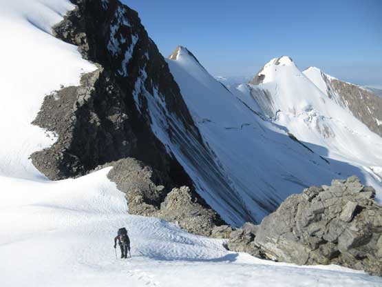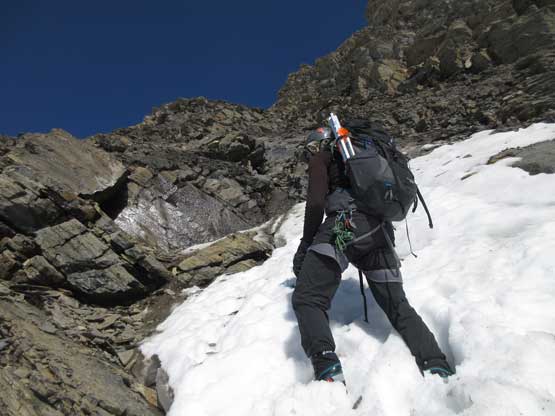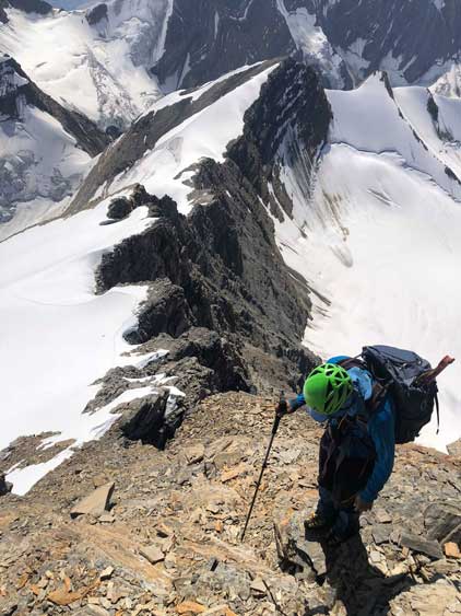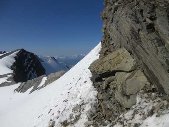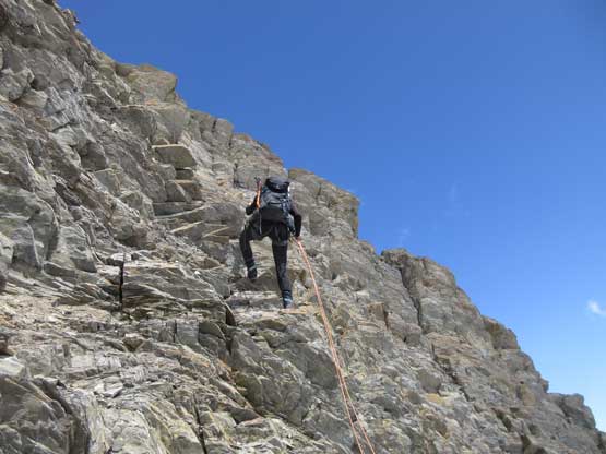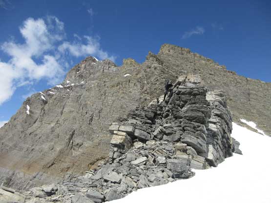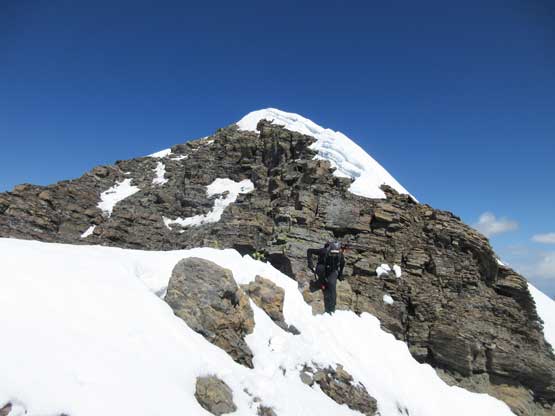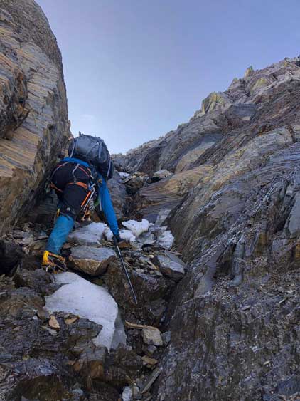 Upwards we started by traversing/ascending snow to the right of the ridge crest that involved a lot of knee deep post-holing. The post-holing was tedious but not unrealistic so we kept going on snow, until seeing the crux rock band ahead. My original plan was to do the snow bypass by losing 150 m elevation to the right but that route looked shitty and had some steep snow and crevasses to deal with. That would be fine in the right conditions but it’s south-east facing and had been baked under the sun for hours with no overnight freeze in the last two nights whatsoever. The rock step didn’t look too bad so why not. The scrambling along the ridge soon became worse than appeared because the rocks were mostly down-sloping dinner plates that broke easily upon touching. The scrambling was mostly exposed class 3-4 up until the last 15 meters but required extreme care. We took the rope out at the last rock step and meanwhile I swapped my mountaineering boots for rock shoes. Oakley was a much better rock climber but I was the one hauling rock shoes so I should lead. There’s one fixed piton to clip in halfway up but even with that extra bit of security I couldn’t make the 5.8 move over that overhanging lip. I probably can do it without a pack but not wanting to risk a fall I lowered myself by grabbing the sling I clipped into that piton, and went around on ledges down and out to climber’s right. I put in a size 1 cam and got up a few tricky low 5th class moves then done, but there came more problems. The rope was seriously dragged that I could not pull it up at all. After lots of cursing and frustration I simply detached myself from the rope and informed Oakley that he had to toss the opposite end directly upwards to me by wrapping the end around a rock. The first toss wasn’t even close but he got the second try perfectly done. With a top rope belay Oakley managed to mangle up that 5.8 lip with a heavy pack and on mountaineering boots. Impressive!