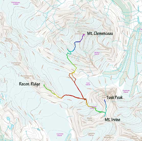 Ascent routes for Clemenceau, Tusk, Irvine and Reconnaissance Ridge. GPX DL