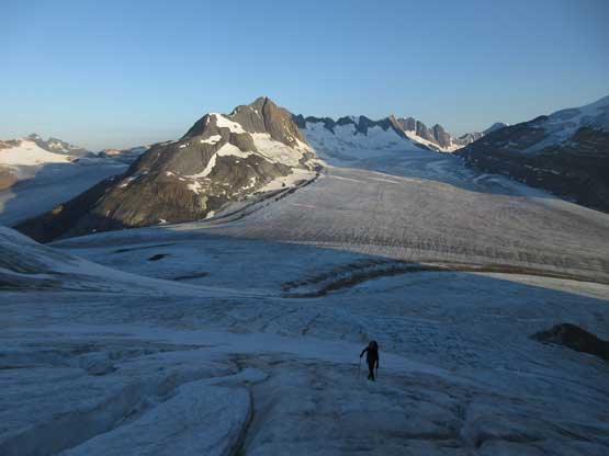 The thunderstorms had stopped overnight and we woke up at 5:30 am just after it’s bright enough to not need headlamps. I’m not a huge fan of starting in dark unless the route is obvious, and we figured there’s no particular reason to start super early on Tusk Peak anyway. The ascent of the dry Tusk Glacier looked steep but actually not. The slope angle was mostly 25-30 degrees that we could easily walk on crampons. We picked a rising traverse line out towards climber’s right passing a few deep, but not big crevasses and eventually pulled the rope out and merged onto snow after gaining ~200 m elevation. We had taken a lot of beta photo of this glacier from both the helicopter ride and higher up on Mt. Clemenceau so we knew where exactly to go. A steep, rightward traversing ramp wasn’t super obvious but that did give us the least amount of crevasses to deal with. The snow was unfortunately isothermal on this traversing ramp. We only had to probe carefully for one short stretch and didn’t have to step across any sketchy snow bridges, and in short time we were cramponing up firm snow towards the steep couloir underneath Tusk/Irvine col.