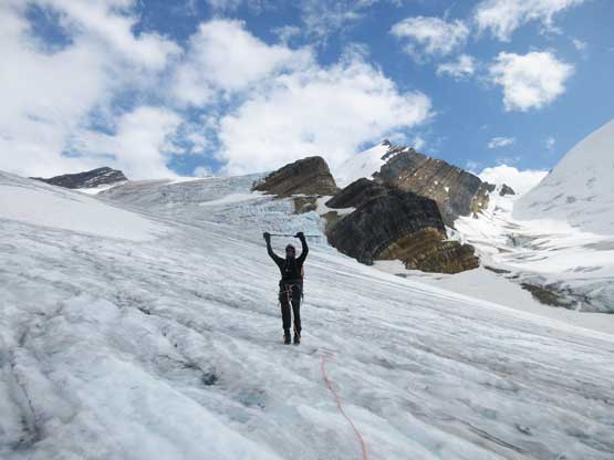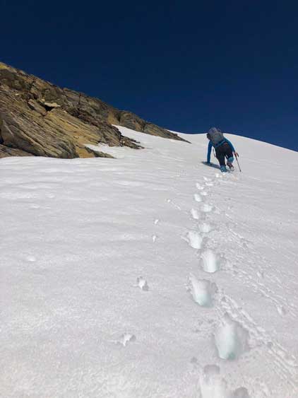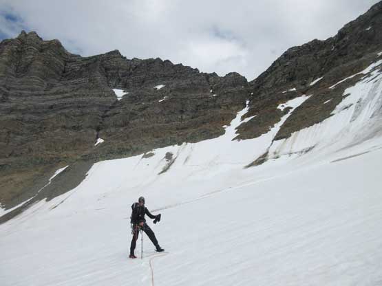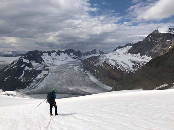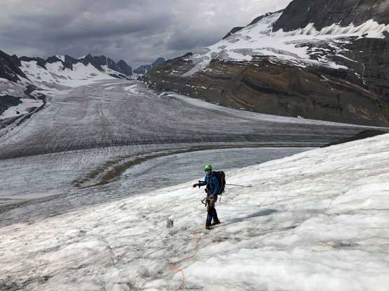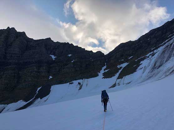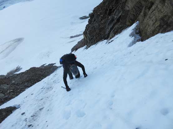 The thunderstorms had stopped overnight and we woke up at 5:30 am just after it’s bright enough to not need headlamps. I’m not a huge fan of starting in dark unless the route is obvious, and we figured there’s no particular reason to start super early on Tusk Peak anyway. The ascent of the dry Tusk Glacier looked steep but actually not. The slope angle was mostly 25-30 degrees that we could easily walk on crampons. We picked a rising traverse line out towards climber’s right passing a few deep, but not big crevasses and eventually pulled the rope out and merged onto snow after gaining ~200 m elevation. We had taken a lot of beta photo of this glacier from both the helicopter ride and higher up on Mt. Clemenceau so we knew where exactly to go. A steep, rightward traversing ramp wasn’t super obvious but that did give us the least amount of crevasses to deal with. The snow was unfortunately isothermal on this traversing ramp. We only had to probe carefully for one short stretch and didn’t have to step across any sketchy snow bridges, and in short time we were cramponing up firm snow towards the steep couloir underneath Tusk/Irvine col.