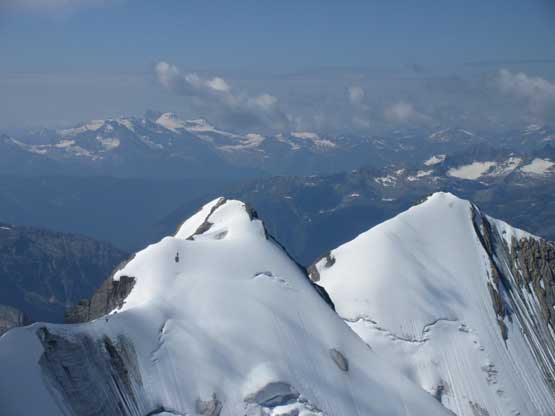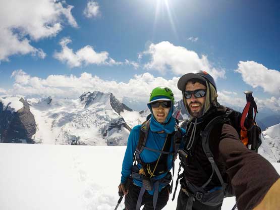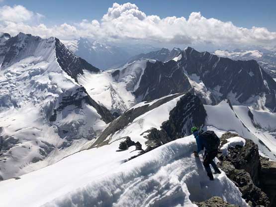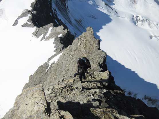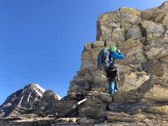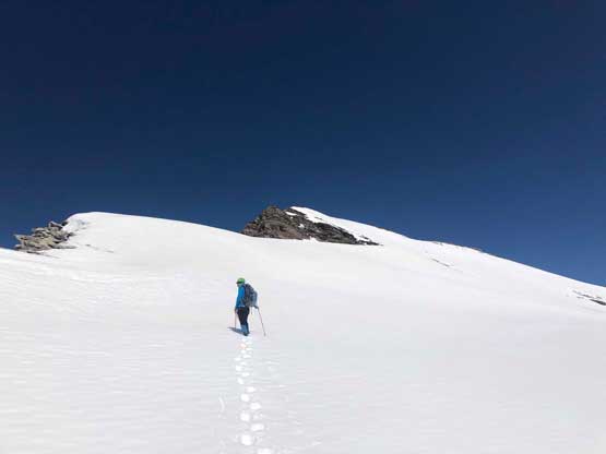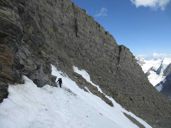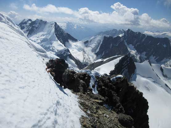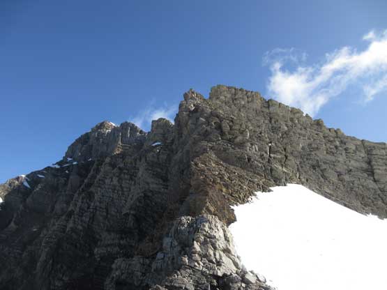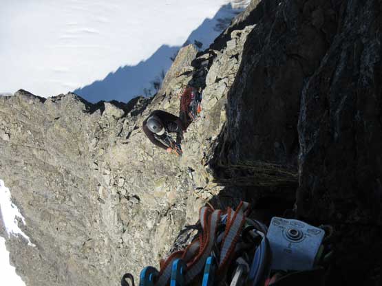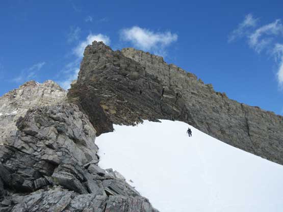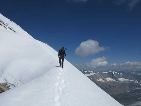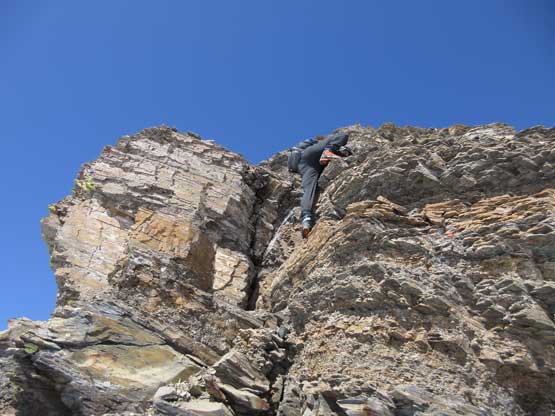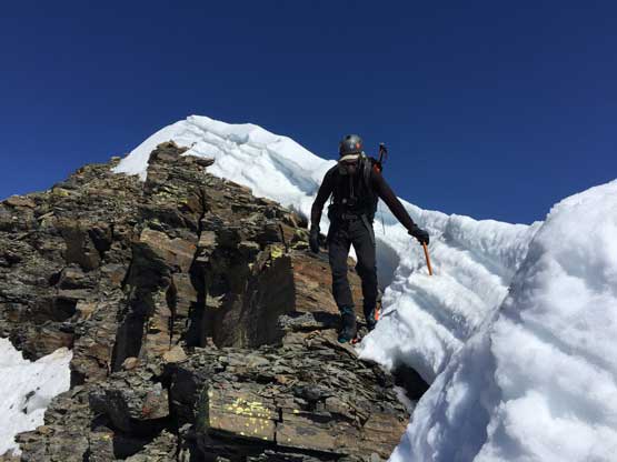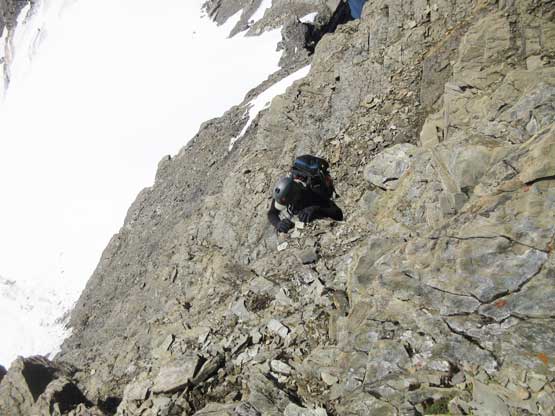Upwards we started by traversing/ascending snow to the right of the ridge crest that involved a lot of knee deep post-holing. The post-holing was tedious but not unrealistic so we kept going on snow, until seeing the crux rock band ahead. My original plan was to do the snow bypass by losing 150 m elevation to the right but that route looked shitty and had some steep snow and crevasses to deal with. That would be fine in the right conditions but it’s south-east facing and had been baked under the sun for hours with no overnight freeze in the last two nights whatsoever. The rock step didn’t look too bad so why not. The scrambling along the ridge soon became worse than appeared because the rocks were mostly down-sloping dinner plates that broke easily upon touching. The scrambling was mostly exposed class 3-4 up until the last 15 meters but required extreme care. We took the rope out at the last rock step and meanwhile I swapped my mountaineering boots for rock shoes. Oakley was a much better rock climber but I was the one hauling rock shoes so I should lead. There’s one fixed piton to clip in halfway up but even with that extra bit of security I couldn’t make the 5.8 move over that overhanging lip. I probably can do it without a pack but not wanting to risk a fall I lowered myself by grabbing the sling I clipped into that piton, and went around on ledges down and out to climber’s right. I put in a size 1 cam and got up a few tricky low 5th class moves then done, but there came more problems. The rope was seriously dragged that I could not pull it up at all. After lots of cursing and frustration I simply detached myself from the rope and informed Oakley that he had to toss the opposite end directly upwards to me by wrapping the end around a rock. The first toss wasn’t even close but he got the second try perfectly done. With a top rope belay Oakley managed to mangle up that 5.8 lip with a heavy pack and on mountaineering boots. Impressive!