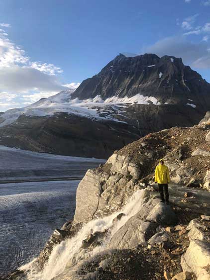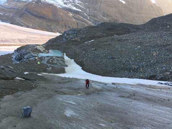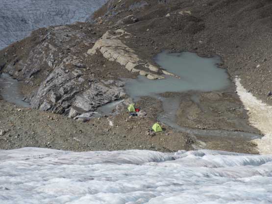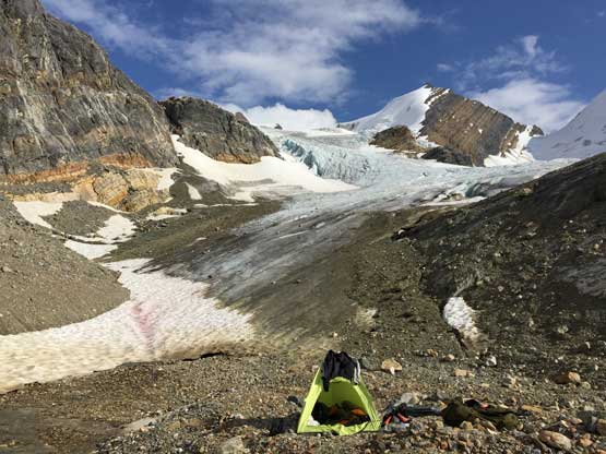The descent of the couloir underneath Tusk/Irvine col started by some down-scrambling (on crampons), and then two rappels. The first rappel didn’t quite reach the second station with Oakley’s 50 m rope so we had to do a bit of down-climbing. The second rappel got us onto continuous snow and then we had an easy down-climb back to the bergschrund. The roping-up transition was awkward on a sloping slope like this but given the sketchy snow conditions we just had to play it safe. Some of our tracks in the morning had melted out on the glacier such that I had to use GPS to navigate, but for most sections we could just follow our own tracks. Lower down we went a little bit further down on ice before making that horizontal traverse back to our camp, as this avoided a few step-across over open crevasses. We arrived back to camp with a couple hours till sunset so the evening routing was pretty relaxed. That night we got poured on again by thunderstorms and the lightnings were again, seemed close.