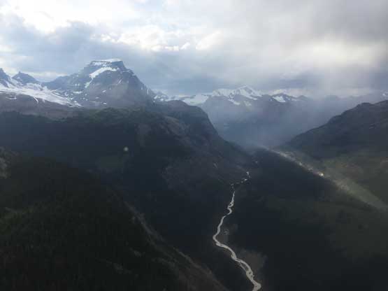 The planned helicopter pick-up was before noon on Friday (Day 5) so we slept in till 9 am, had a leisure breakfast and packed things up. There wasn’t enough time for us to do anything on the last day so we just waited. Oakley received a message via inReach at 11:30 am that the heli had arrived at Fortress Lake but in another half an hour we had no sight of the heli. Oakley texted back to his boss and sure there was a problem. Ralph forgot to pick us up and a young pilot came to the campsite instead of Ralph himself. The young pilot were not allowed to fly into unknown locations and the new plan was to pick us up at 7 pm. This was not good because the weather was supposed to turn shit in the afternoon and remain shit for at least the next three days. I did have extra food but Oakley had zero extra food to stay for even one extra day. What a shit show… We were both very angry about the mess so we texted back saying we had no food and if Ralph couldn’t pick us up in the evening then our only “alternative plan” was to press SOS to initiate a rescue. I have learnt from international travelling/climbing friends that sometimes you must push people in a pressurized way and this came in practice. The weather did hold off for us but was apparently very shitty in the Alberta side of the divide, but Ralph did come at 7:30 pm to pick us up. Oakley had to be dropped off at Fortress Lake for work and it was already pouring at the lake. The flying back to Cline River was scenic and very dramatic. Awesome weather as we flew by Mt. Alberta but the last leg down Cline River was done right in an intense lightning storm…