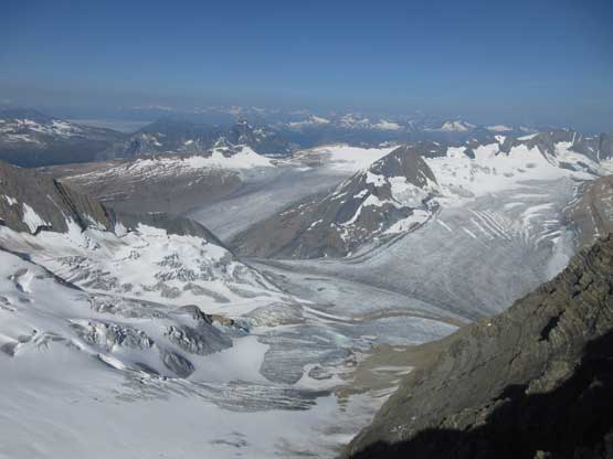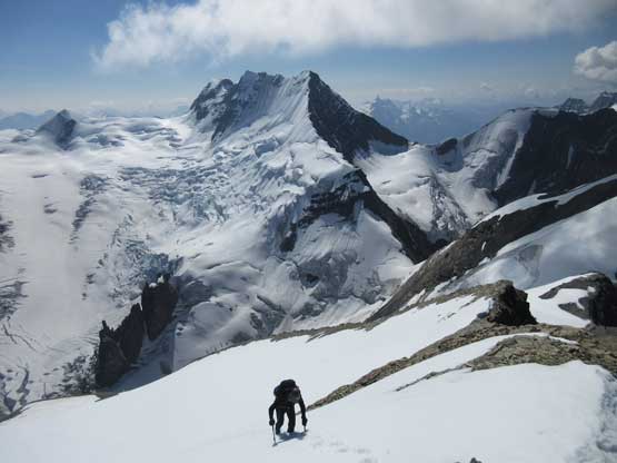 Reversing the two steps on the summit ridge wasn’t as hard as we thought and the down-climb of the long 3rd class stretch wasn’t too bad neither. The post-holing had become even worse on the flat sections and before committing to the steeper bypasses we would toss as much rocks down as we could to trigger all of the wet snow. We did trigger at least a few size 2 slides on the tracks we just ascended a few hours earlier so that was quite freaky. It turned out that we didn’t have to step onto steep snow by down-climbing some 4th class choss on the ridge crest. The crux zone required at least three rappels but after three raps using existing stations we were both too tired to down-climb exposed shit. I noticed a chicken head rock on the climber’s right side, checked it and made an anchor to extend our rappel. The 4th rappel got us onto snow. The steep traverse underneath the crux zone wasn’t avoidable and we were glad we didn’t trigger anything there. The grade of the snow under the crux zone wasn’t steep anymore and in another while we were back to Tusk/Irvine col. Despite the tiredness I had to slog up Mt. Irvine because it’s right there. Oakley wasn’t very keen but followed up nonetheless. The views were pretty good and we were both glad we didn’t lazy it out.
