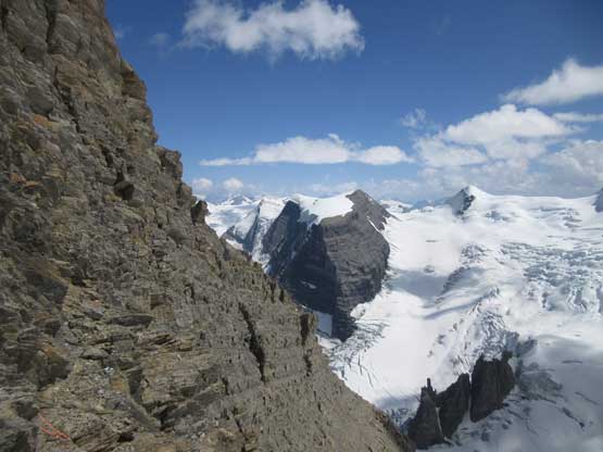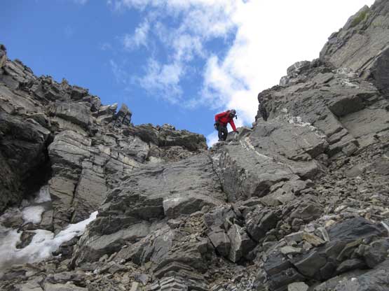 The ascent to the col appeared shitty and it sure was. The bergschrund at the bottom imposed no problem and then we had some easy 40-degree snow climbing but the snow ran out in short time. There were at least three wet and down-sloping 4th class steps in the middle of this gully that felt downright sketchy (I hate using crampons on rocks) but thankfully we did pass two solid rappel stations on the sides. We kept the crampons all the way to Tusk/Irvine col and the upper gully had mostly just class 2-3 scrambling, albeit on nothing but Rockies choss. The col offered our first head-on view of Mt. Shackleton and provided a natural spot to take our first long break of the day.