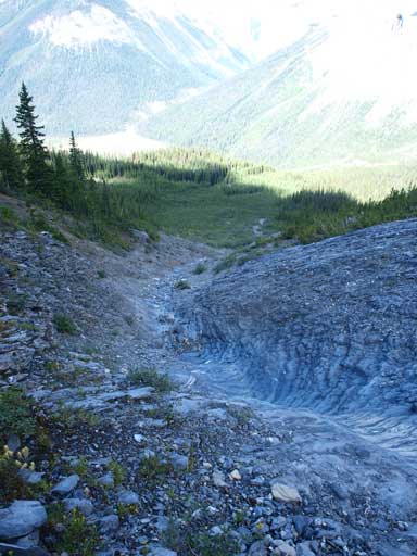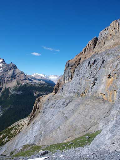 Circumventing the lake, we soon passed a campground. Comparing to Little Yoho, this campground was much quieter. After that, we had to follow the signed trail towards Emerald Pass. The trail travelled beneath the impressive cliffs for a short distance then entered the woods again. Soon after that the view opened up and we were in an avalanche gully. Note: This is not the gully you want to ascend. We kept going along the trail for another 5 min, then we arrived at the big avalanche slope. There we go, this was the one we wanted to ascend. By this point, you should be amazed by the view of Mount Carnavon and The Presidents.