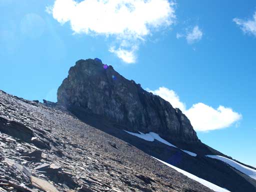 After climbing up through this black band, we were on a upper bowl looking towards another more broken brown band. We chose to ascend steep talus / boulder field to aim for an obvious break straight ahead. It appeared very loose, but turned out to be very solid. I almost never have fun on boulder field and talus slope, but this time I did. Some hands-on moves were required before topping out. Now we could see the entire summit block. We decided to go climber’s left aiming for the left skyline ridge, but what a mistake… Although we had solid ground going towards the summit block, we had to side-slope on crappy talus slope on frozen solid ground around the base of it, which was very tedious…