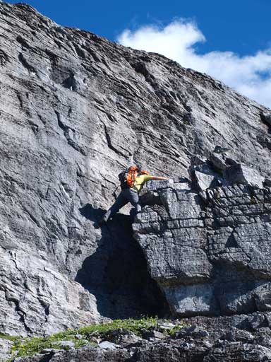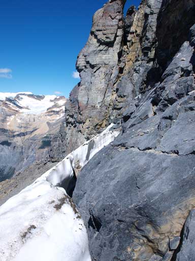 Traversing over the north corner, we were back on route again. We traversed under the impressive cliffs while keeping our eye on them for searching the possible routes up. At one point we had to wedge in between rock and snow. The correct chimney was hard to miss as it was marked by cairns and flagging. We also spotted Vern’s bypass ledge. Kevin tried the ledge but backed off as he thought it was too exposed. Therefore we decided to rope up the chimney. From below, it didn’t look that serious though.