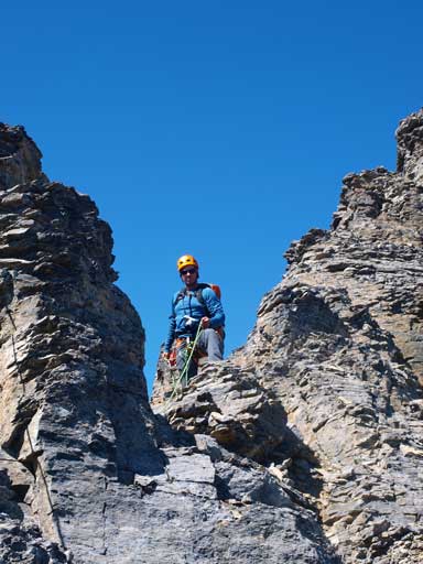 Kevin led up the chimney, which in his opinion, was a pitch of 5.3 rock. There’s one awkward and exposed move involved. After this pitch, there’s another 5.4 rock step, but not super exposed. I’m not expert on grading but I feel it’s more technical than Fisher Peak’s crux, though as exposed. After this section we topped out on the exposed south ridge. I led up that section while practicing placing protection. Soon we stood on the summit.