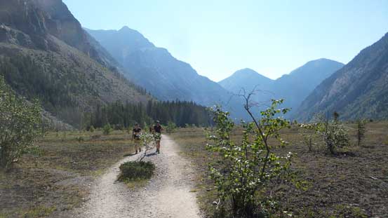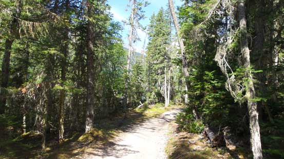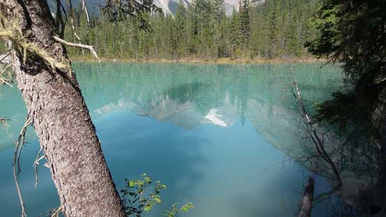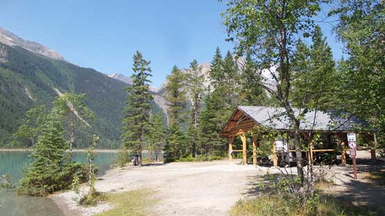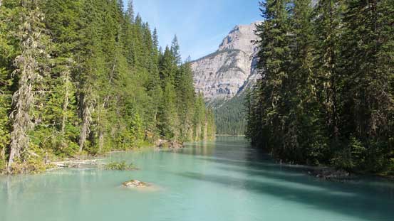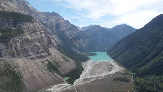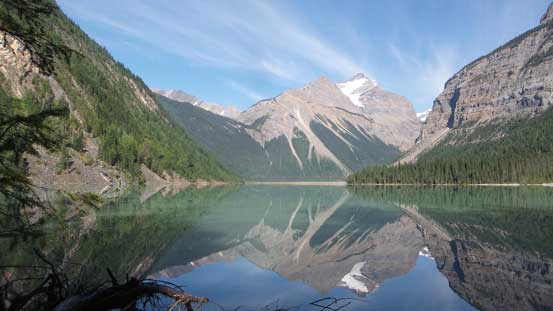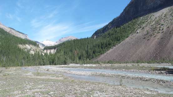 Given the freezing level as high as 4200 meters it’s an easy decision to avoid glacier travel for as much as possible so the “valley to the south” and that’s it. Right off the bat we could feel the heat beating down but with lots of chatting the initial march to Kinney Lake was actually quite enjoyable and soon enough we passed the Patterson’s Spur turn-off and then it’s all “new ground” to me. The circumvention of Kinney Lake was a bit of a grunt but at least the views were inspiring. The trail then did more up-and-downs on the hillside of Kinney Flats before dropping down and crossing the braided Robson River on a couple foot bridges. One of the crossings was a major one that without the bridge there’d be no way. We continued to the base of a set of switchbacks before taking the first break applying sunscreen, having some food/drinks and most importantly, switching footwear from trail-runners to my Trango Ice Cubes.