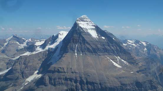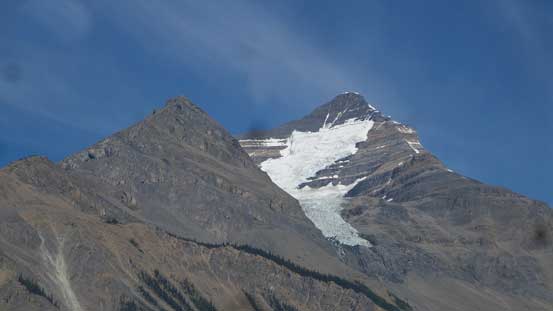 As much as being part of the “Robson Group”, the northernmost 11,000er namely Whitehorn Mountain is completely unattached to the massif of Mt. Robson, separated by the white waters of Robson River and the Valley of a Thousand Falls. This striking horn of snow, ice and rocks is a inspiring and yet frightening-looking peak from any side and the profile is a good match to some of the more famed giants further to the south. It is therefore the proximity to Mt. Robson that puts a damper on things which is very much unfortunate. Like Corbett mentions in his The 11,000ers of Canadian Rockies, “[this] handsome peak would draw considerably more attention if located elsewhere”.