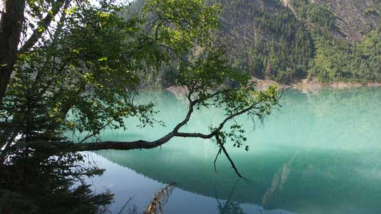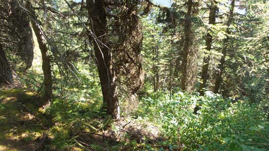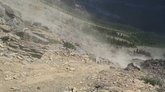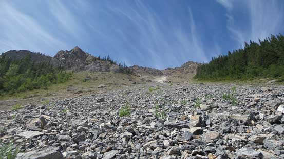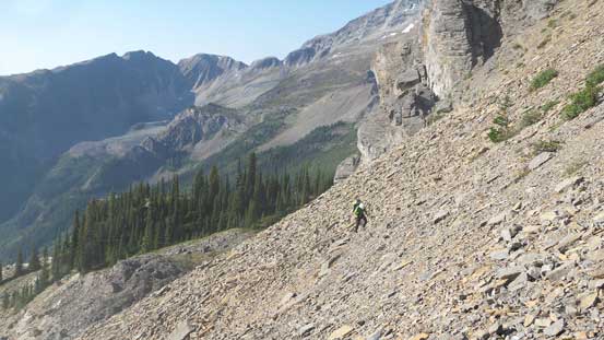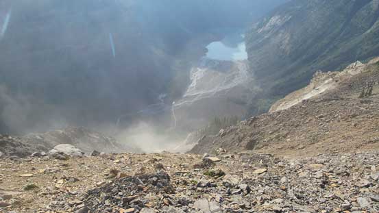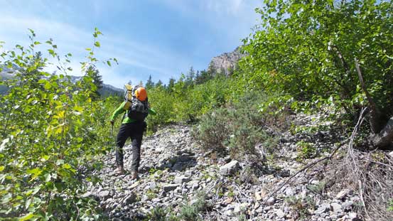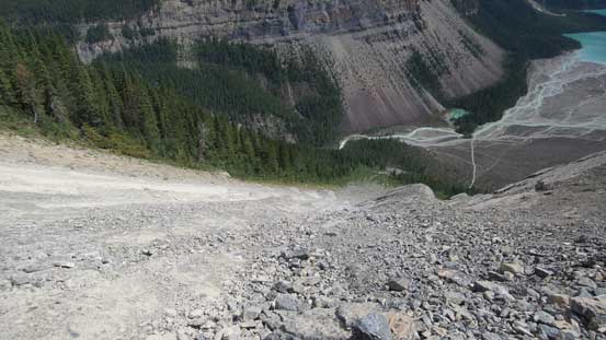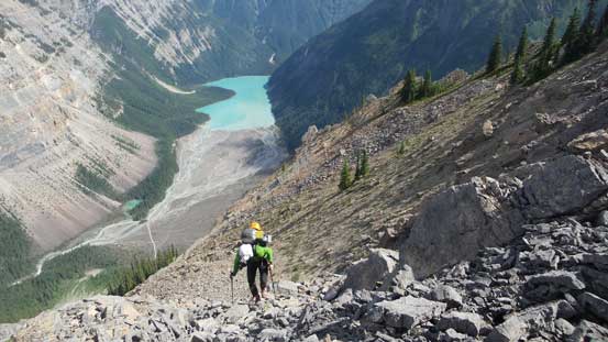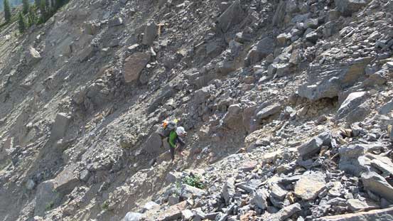 The start of that “big ass scree gully” is about two or three switchbacks higher up but once there it’s very obvious where we should leave the trail. The heat was really taking its toll and we knew the next couple hours would be downright miserable, but let’s face it. About 800 m of elevation must be gained in this stage despite the very foreshortening views. About a couple hundred meters up we started to realize the ground wasn’t much of scree at all and in fact, it’s mostly a layer of dirt/scree on top of compact moraine. The higher we went the steeper the terrain and the thinner the layer of soft scree became and soon enough we were edging on the moraine choss struggling to make any further uphill progress. Everything we touched would move and anything we sent down would tumble at least a couple hundred meters without coming to a stop whether it’s a pebble, baseball or a microwave. Ascending parallel to each other and having no party above was the key to survive this gully and even so some dedicated balancing was required as we could not afford a slip. It was so horrible that after eventually topping out on the “treed shoulder” I had to look around for alternative descent options as there’s absolutely no way would I get myself into that top part of the gully again in this lifetime.