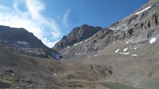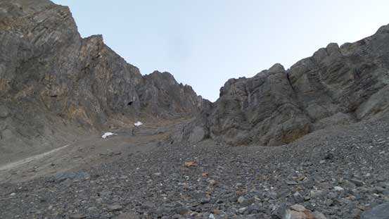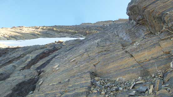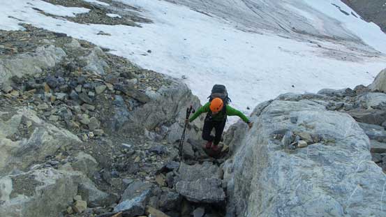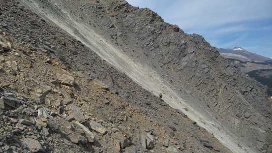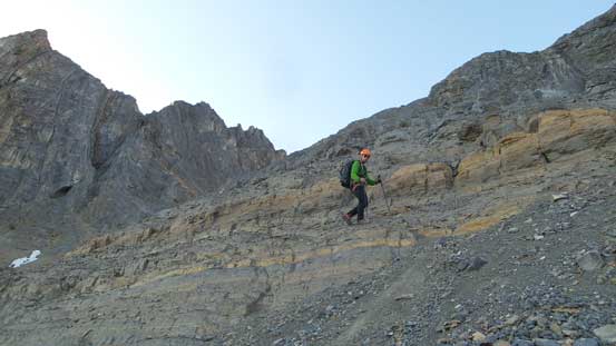 Relieved to finally top out above this moraine cone we still had at least 200 vertical meters of trudge on nothing but treadmill scree or rubble-fuck to access the hanging remnant glacier with a couple 3rd class choss bands thrown here and there. The glacier was a nice welcoming site though with a tiny stream running into a tarn for some drinking water. From there onwards the only route that makes sense was to traverse a long ways due east (climber’s right) before making working back left on one of the scree/snow ledges to access the col high above us on the L.H.S skyline ridge. The glacier travel was tame and easy and we didn’t even need to use crampons thank to the soft snow. Once making sense we ascended a short shooting gallery to gain a lower scree/snow band and traversed about halfway back across the bottom of that triangular-face. At here we made a critical decision to abandon the traversing line and went straight up a snow slope to a 4th class weakness (rap station above) which joined Paul Zizka’s description. The rest of the traverse was done on the upper scree ledge which was loose and exposed but at this point we just sucked it up.