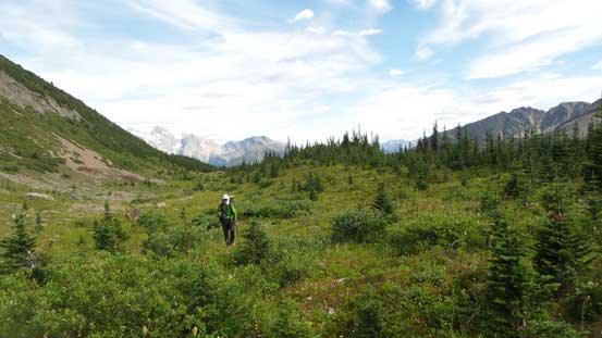 The next morning we managed to get going at a reasonable hour. It wasn’t early as the sun was already up for a while, but good enough. Walking back across that grassy ledge was a welcomed change of pace but then we had to face that gully section. Using our earlier observation we regained some height and traversed farther down-climber’s left. The ridge didn’t look much better but at least avoids much of the rock-fall issue comparing with the gully route. There’s still a ton of scrambling on moraines and we sent lots of microwaves down both sides. Even the refrigerators were moving when we touched and that did not look feel right… Eventually we got out of the hell and then into the bush. 500 vertical meters of “BC bush” wasn’t appealing but better than risking slipping on the moraine.