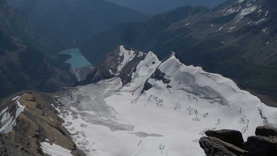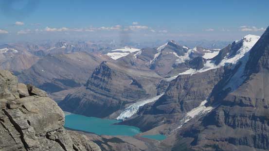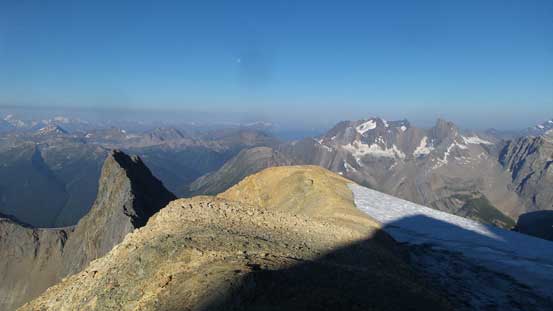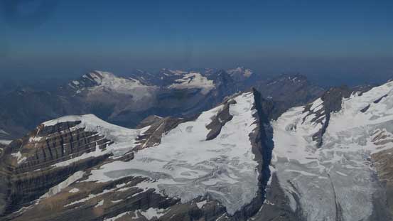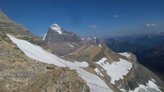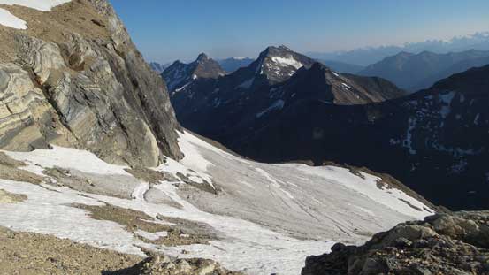 Looking over a sub-summit of Mt. Longstaff towards more unnamed peaks