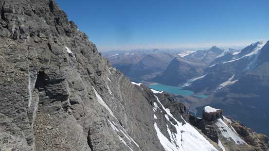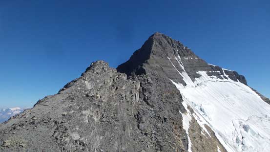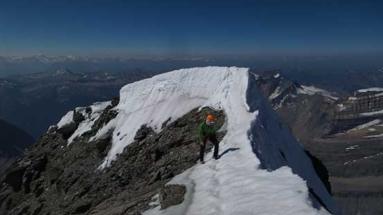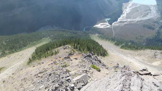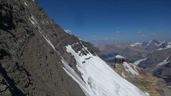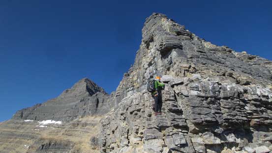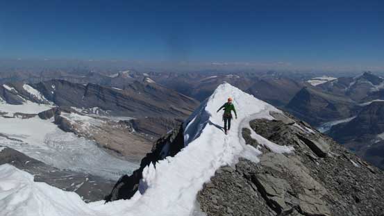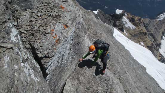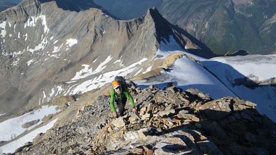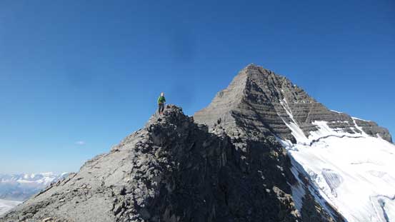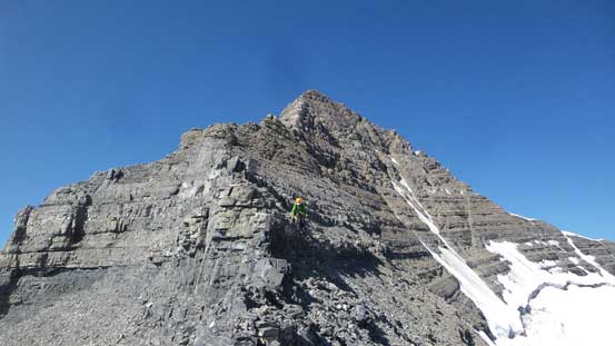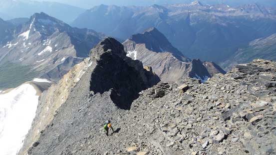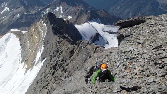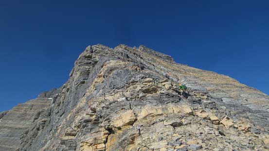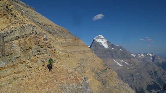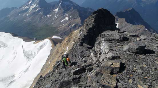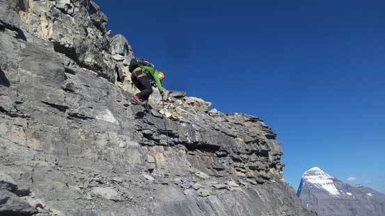 Finally we were officially “on route” as whether you come from the SE Glacier or “Valley to the south” this marks the start-point of the south ridge route. The lower triangular face is attacked on the L.H.S skyline ridge which should go as a mere “difficult scramble”. With that in mind we often had to detour to climber’s right to bypass technical climbing. This stage felt very much similar to the limestone rib on Hungabee’s middle section although the rock quality was worse. The nature of the ridge felt more like on Deltaform with lots of big resting ledges so it’s not sustained. Towards the top it did get more difficult and both Steven’s line and mine involved a few tricky moves with considerable exposure, but then we topped out above the triangular face with the south ridge straight ahead.