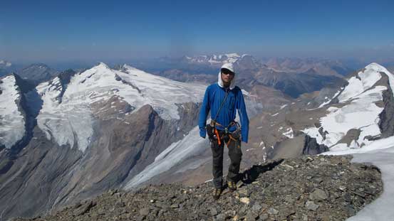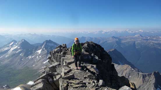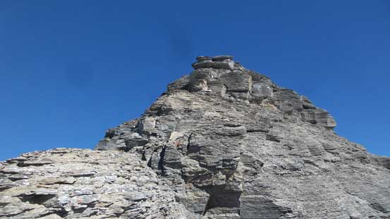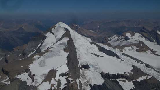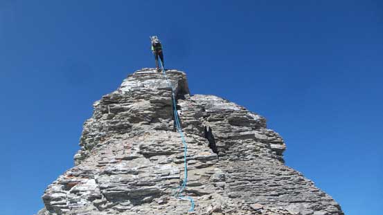 In general on this type of down-sloping terrain the steps would turn out harder than it looked from below. We both soloed the first short pitch and I continued on soloing the second pitch. It ran much hairy than I thought but I made to the upper station nonetheless and tossed the rope down to Steven for a added bit of security. After that we properly pitched out a couple steps with Steven and I swinging on lead and then the terrain transitioned back to “scrambling” so we packed the rope. There went another 5th class pitch with a gendarme feature bypassed on loose, down-sloping ledges on climber’s right side, followed by another exposed and awkward ledge and then we were staring at the summit block. The block was attacked on climber’s right side by a series of steps and we all soloed no problem. The terrain soon eased off and there goes my 44th 11,000er in the bag. We lingered on the summit for at least 1.5 hours soaking in the views and taking a nap. Meanwhile I got bitten by mosquitoes and that tells how toasty that day was…