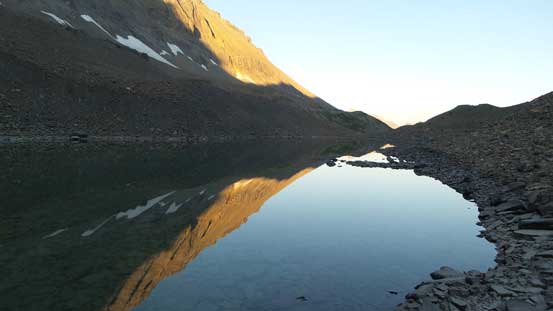 With a longer summit day we agreed to wake up early, but not too early as we didn’t want to negotiate the shitty moraine in dark. It appeared complicated to access the upper remnant glacier and bench and we wanted at least some daylight for that part. After a whole process of morning routine we eventually got going with only 20 minutes of travel assisted by head-lamps skirting around the south shore of that tarn. And then we went into a depression zone and traversed a long ways due west and this whole section was nothing but rubble-fuck hopping and once at the base of a moraine cone we turned right and began the trudge. Slogging up this moraine section was downright dreary. At places as soon as I put some pressure on the scree and whole cone would slide down starting from 30 feet above. Immediately jumping over to the side I thought I was going to get rock-avalanched off the slope.. And of course once the slope angle increased the choss layer became thinner and we gotta deal with edging on compact ground which was sketchy to say the least. There’s a band of “4th class black rocks” farther on climber’s right which we on purposely ascended. The worst type of terrain on Hungabee or Deltaform felt super solid and enjoyable here by comparison…