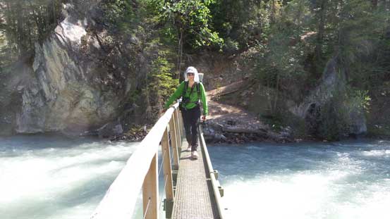Given the freezing level as high as 4200 meters it’s an easy decision to avoid glacier travel for as much as possible so the “valley to the south” and that’s it. Right off the bat we could feel the heat beating down but with lots of chatting the initial march to Kinney Lake was actually quite enjoyable and soon enough we passed the Patterson’s Spur turn-off and then it’s all “new ground” to me. The circumvention of Kinney Lake was a bit of a grunt but at least the views were inspiring. The trail then did more up-and-downs on the hillside of Kinney Flats before dropping down and crossing the braided Robson River on a couple foot bridges. One of the crossings was a major one that without the bridge there’d be no way. We continued to the base of a set of switchbacks before taking the first break applying sunscreen, having some food/drinks and most importantly, switching footwear from trail-runners to my Trango Ice Cubes.