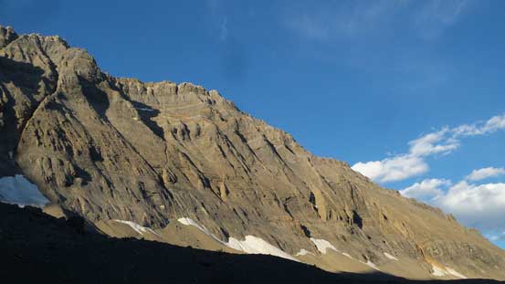 With a longer summit day we agreed to wake up early, but not too early as we didn’t want to negotiate the shitty moraine in dark. It appeared complicated to access the upper remnant glacier and bench and we wanted at least some daylight for that part. After a whole process of morning routine we eventually got going with only 20 minutes of travel assisted by head-lamps skirting around the south shore of that tarn. And then we went into a depression zone and traversed a long ways due west and this whole section was nothing but rubble-fuck hopping and once at the base of a moraine cone we turned right and began the trudge. Slogging up this moraine section was downright dreary. At places as soon as I put some pressure on the scree and whole cone would slide down starting from 30 feet above. Immediately jumping over to the side I thought I was going to get rock-avalanched off the slope.. And of course once the slope angle increased the choss layer became thinner and we gotta deal with edging on compact ground which was sketchy to say the least. There’s a band of “4th class black rocks” farther on climber’s right which we on purposely ascended. The worst type of terrain on Hungabee or Deltaform felt super solid and enjoyable here by comparison…