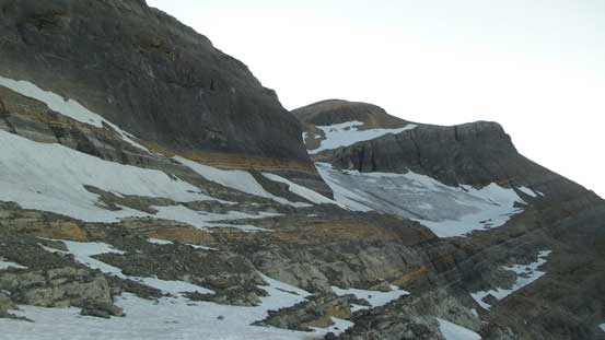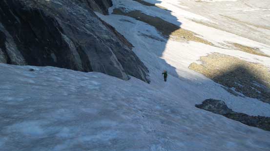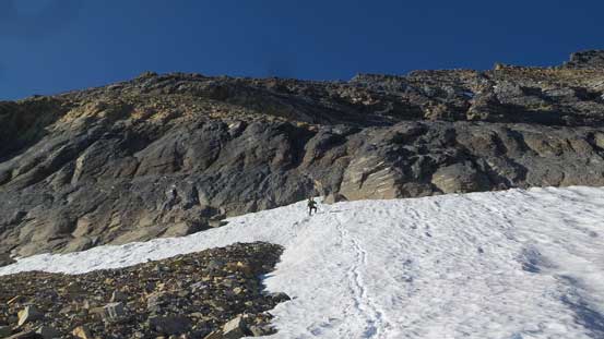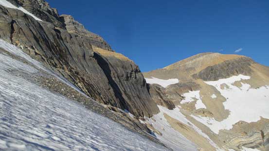 Relieved to finally top out above this moraine cone we still had at least 200 vertical meters of trudge on nothing but treadmill scree or rubble-fuck to access the hanging remnant glacier with a couple 3rd class choss bands thrown here and there. The glacier was a nice welcoming site though with a tiny stream running into a tarn for some drinking water. From there onwards the only route that makes sense was to traverse a long ways due east (climber’s right) before making working back left on one of the scree/snow ledges to access the col high above us on the L.H.S skyline ridge. The glacier travel was tame and easy and we didn’t even need to use crampons thank to the soft snow. Once making sense we ascended a short shooting gallery to gain a lower scree/snow band and traversed about halfway back across the bottom of that triangular-face. At here we made a critical decision to abandon the traversing line and went straight up a snow slope to a 4th class weakness (rap station above) which joined Paul Zizka’s description. The rest of the traverse was done on the upper scree ledge which was loose and exposed but at this point we just sucked it up.