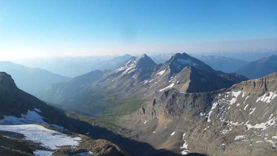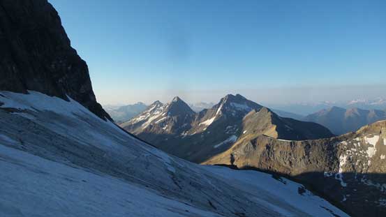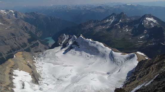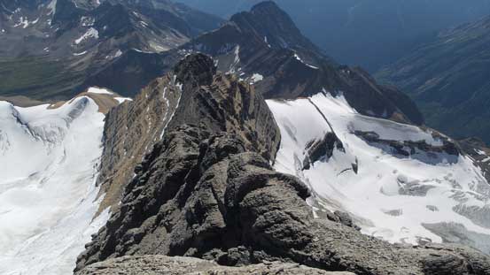 Looking over a sub-summit of Mt. Longstaff towards more unnamed peaks