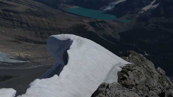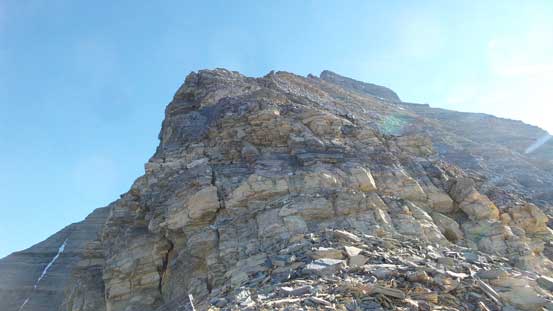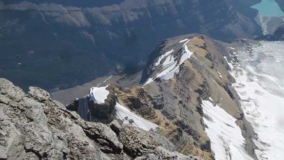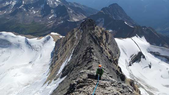 Finally we were officially “on route” as whether you come from the SE Glacier or “Valley to the south” this marks the start-point of the south ridge route. The lower triangular face is attacked on the L.H.S skyline ridge which should go as a mere “difficult scramble”. With that in mind we often had to detour to climber’s right to bypass technical climbing. This stage felt very much similar to the limestone rib on Hungabee’s middle section although the rock quality was worse. The nature of the ridge felt more like on Deltaform with lots of big resting ledges so it’s not sustained. Towards the top it did get more difficult and both Steven’s line and mine involved a few tricky moves with considerable exposure, but then we topped out above the triangular face with the south ridge straight ahead.
