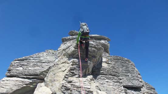 In general on this type of down-sloping terrain the steps would turn out harder than it looked from below. We both soloed the first short pitch and I continued on soloing the second pitch. It ran much hairy than I thought but I made to the upper station nonetheless and tossed the rope down to Steven for a added bit of security. After that we properly pitched out a couple steps with Steven and I swinging on lead and then the terrain transitioned back to “scrambling” so we packed the rope. There went another 5th class pitch with a gendarme feature bypassed on loose, down-sloping ledges on climber’s right side, followed by another exposed and awkward ledge and then we were staring at the summit block. The block was attacked on climber’s right side by a series of steps and we all soloed no problem. The terrain soon eased off and there goes my 44th 11,000er in the bag. We lingered on the summit for at least 1.5 hours soaking in the views and taking a nap. Meanwhile I got bitten by mosquitoes and that tells how toasty that day was…