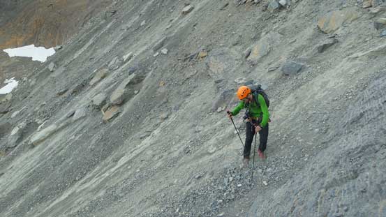 The start of that “big ass scree gully” is about two or three switchbacks higher up but once there it’s very obvious where we should leave the trail. The heat was really taking its toll and we knew the next couple hours would be downright miserable, but let’s face it. About 800 m of elevation must be gained in this stage despite the very foreshortening views. About a couple hundred meters up we started to realize the ground wasn’t much of scree at all and in fact, it’s mostly a layer of dirt/scree on top of compact moraine. The higher we went the steeper the terrain and the thinner the layer of soft scree became and soon enough we were edging on the moraine choss struggling to make any further uphill progress. Everything we touched would move and anything we sent down would tumble at least a couple hundred meters without coming to a stop whether it’s a pebble, baseball or a microwave. Ascending parallel to each other and having no party above was the key to survive this gully and even so some dedicated balancing was required as we could not afford a slip. It was so horrible that after eventually topping out on the “treed shoulder” I had to look around for alternative descent options as there’s absolutely no way would I get myself into that top part of the gully again in this lifetime.