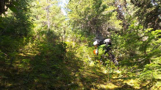 The next morning we managed to get going at a reasonable hour. It wasn’t early as the sun was already up for a while, but good enough. Walking back across that grassy ledge was a welcomed change of pace but then we had to face that gully section. Using our earlier observation we regained some height and traversed farther down-climber’s left. The ridge didn’t look much better but at least avoids much of the rock-fall issue comparing with the gully route. There’s still a ton of scrambling on moraines and we sent lots of microwaves down both sides. Even the refrigerators were moving when we touched and that did not look feel right… Eventually we got out of the hell and then into the bush. 500 vertical meters of “BC bush” wasn’t appealing but better than risking slipping on the moraine.