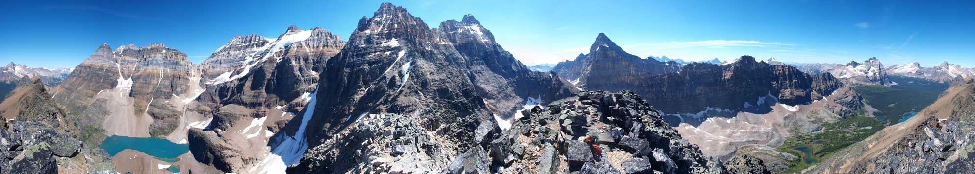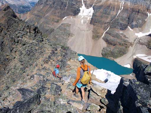 The ascent gully showed up obviously and was straightforward even for novice scramblers. There were cairns here and there and it’s hard to get lost. I wasn’t keen on the lower north summit, so I went all the way to the col, where I was treated with the head-on view of Abbot Pass and Lake Oesa. I made the scramble harder by trying to stick to the ridge. This way, I would rate my route as a “difficult scramble”. The other two scramblers traversed below and their way was easier by comparison. Why did I do this? I was told the scrambling was fun on the ridge, and I have to agree.