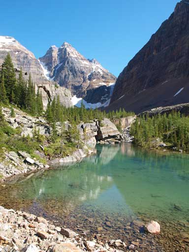We used the “moderate” descent route and except for kicking down rocks, it was very straightforward. To go this way up, you have to look carefully for the cairns and resist to gain elevation too quickly near the col. By the time we got back to Opabin Lake, the afternoon light had made Hungabee Mountain look more impressive.