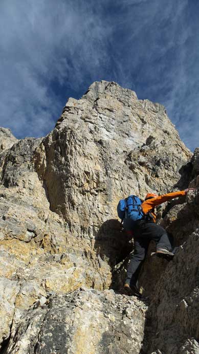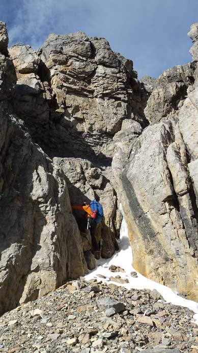 Looking up we could see a complicated system of cliff bands guarding the summit block. It appeared easier if going way to the climber’s left side but there’s no guarantee neither. Craig did not give too much information so we figured it would become obvious once we got closer, so we aimed more-or-less straight up, but slightly to the left side. This brought us to a big gully. Looking upwards it didn’t seem very bad so we made the first decision to ascending this gully. Terrain gradually became harder and after overcoming a few 5th class moves we realized there’s no way to break through the cliff band at this point without sustained exposed climbing. Bad decision.. But to be honest there’s no way we could tell from the col, especially with no detailed route description. We backtracked (awkward down-climbing) and crossed over to the next gully on climber’s left side, only to find bad news again. Well, we had to cross over to the 3rd gully then and this time it looked slightly easier than the previous two. After committing to a few bouldary type of moves I ascended a long and difficult chimney. Topping out I was delighted to see easier terrain ahead. Well I mean, “relatively easier” as we still had to overcome a few 5th class steps. Raff led the way through the final challenges and sure enough, we topped out on the scree slope.