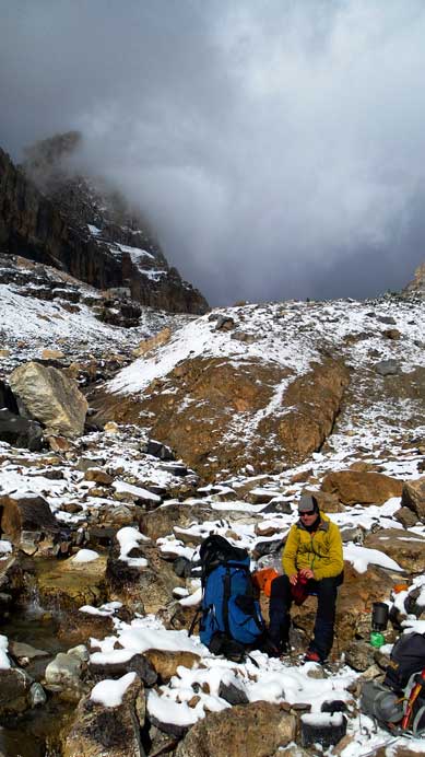 Overnight we witnessed the transition from summer to winter. We didn’t actually go out and check out but we could constantly hear the howling wind as well as rain/snow. To be honest I thought Raff’s tent would get ripped apart anytime. Good thing it didn’t. In the morning we woke up in a snow blizzard with no visibility. Great… We went back to sleep and about 1 hour later weather started to improve a bit (sort of). Considering we still have about 2 km glaciated terrain to ascend we had to take advantage of this short weather window. We didn’t even bother with breakfast, quickly broke camp and started the trudge back towards Cline/Resolute col. There was about 10-15 cm of new snow aiding our steep snow climb but made the final crevasse avoidance trickier. We had to carefully probe making sure to step on that solid snow bridge.