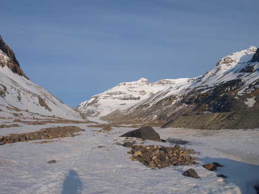 From the valley bottom to the toe of Saskatchewan Glacier, it’s a mix of moraine and snow… This is probably the worst type of terrain especially on the way down when the snow has softened. On top of that we had to battle against a not-overly-strong, but cold and sustained head wind. After trying to stay on snow for a few kilometers we got tired of the hopping so removed the snowshoes and just walked on the moraine. We stayed on the left side of the main stream and ended up being on the left side of the thawing lake. An overhanging glacier blocked our way in… We had to back track for about 500 m to find a solid place to cross to the other side. It did work, but lots of up-and-downs were involved. Near the toe, there are several mini stream crossings and mom carelessly slipped into one and got her boots soaked…