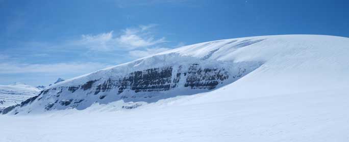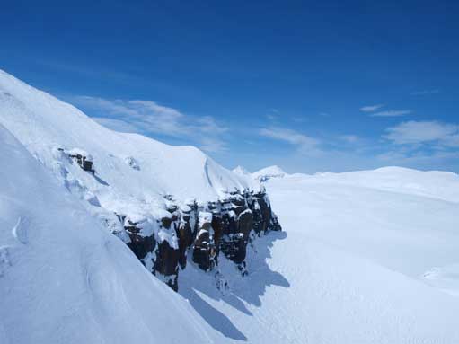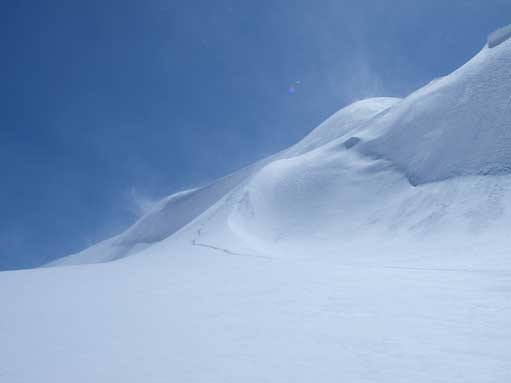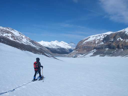We weren’t quite sure what to expect for the glacier but immediately after the initial rise I found bare ice that’s clearly due to wind blown. Probing through, I found the snow was actually quite shallow and we roped up soon. I agreed with what Nugara described in his book: walking on Saskatchewan Glacier is like driving to Saskatchewan… There’s little to explain, just to follow the glacier, staying on right of center. You will find a medial moraine seperating the main glacier from the branch coming from the slope of Andromeda. Staying left of this moraine and follow it up. Near Castleguard Meadows, the glacier swings right slightly and gets steeper for a short section. For the next several kilometers towards the final headwall, we could see the impressive ice falls along the slope of Mount Andromeda, which makes the approach a little bit more interesting.