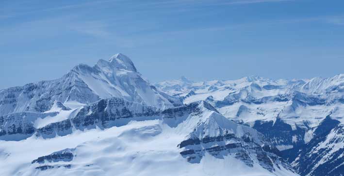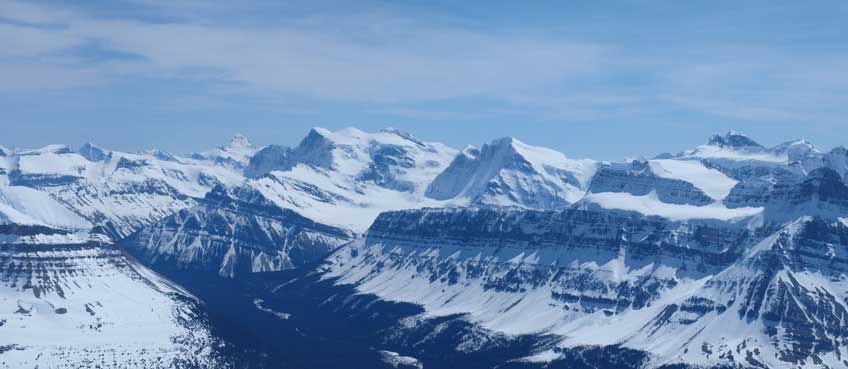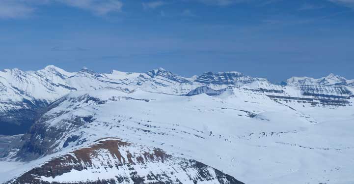 Mt. Forbes rises behind Lyell I, II, III. Oppy Mountain right of center and Mt. Alexandra on far right.