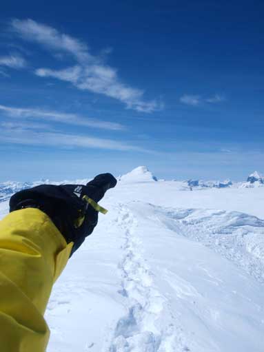 The ramp up the north slope of Castleguard appeared immediately to our left, but actually quite far away. We kept marching up and the round-shaped Snow Dome gradually showed up behind the horizon, followed by the “white whale” – Mt. Columbia. At this point, mom couldn’t continue due to physical limit just like the day on Wapta Icefield last month. After some hesitation and internal debating I made the call to resume the ascent solo, while mom would wait for me on the icefield. As I slowly gaining height up the north-facing slope ahead, North & South Twin slowly appeared behind and the immense Columbia Icefield slowly showed up its entire entity. My objective, Castleguard Mountain looked completely different from its base than from afar so I got confused as which ridge to take. I ascended a steep wind scoop, but only to find that I still topped out on the wrong (north) ridge… Well, I did have Andrew Nugara’s trip report in my memory so I knew how to correct my mistake. After some steep traversing I did mange to make to the final slope and some step-kicking up a 40-degree slope later I arrived at the summit, with mind-blowing views towards every direction.