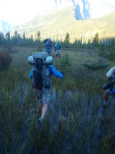 On Friday morning we woke up at 7 and started at about 7:30. There’s a small lake offering our first view of Dragon Peak. It’s really just a small outlier on Catacombs Mountain massive though, but from this campground it looked very impressive and intimidating. The trail quickly led us to Athabasca River crossing where an old suspension bridge spans over. I didn’t feel very secure while walking on this bridge. It looked like the wood pieces would fall apart at any time. Once on the other side, we followed the trail entering the woods again. The trail deviated from the Chaba River but we kept our eyes closely to the supposed crossing. Vern’s GPS was handy here. After bushwhacking down to the flats it was the time to don running shoes.