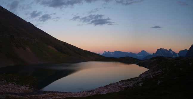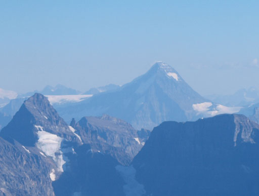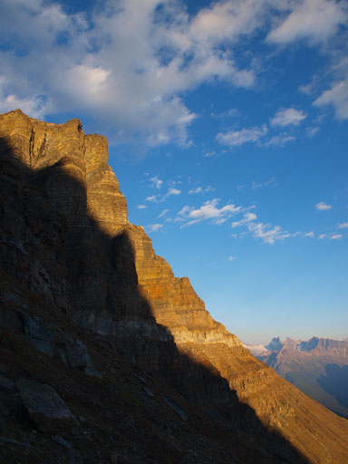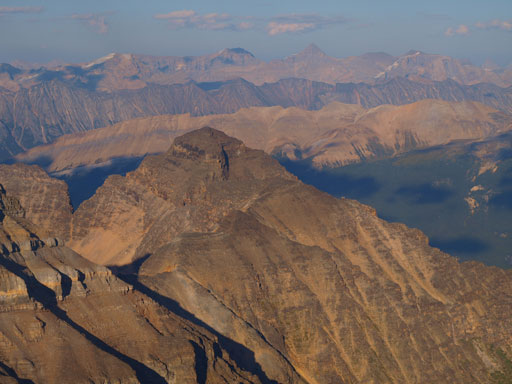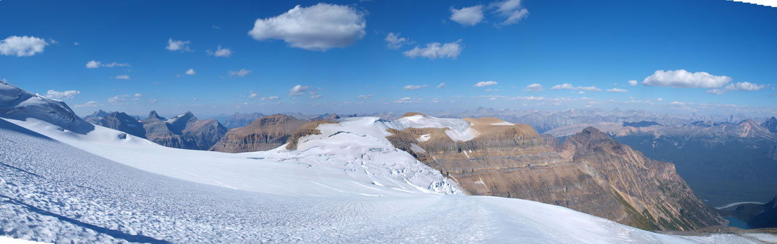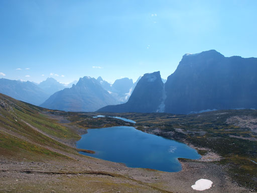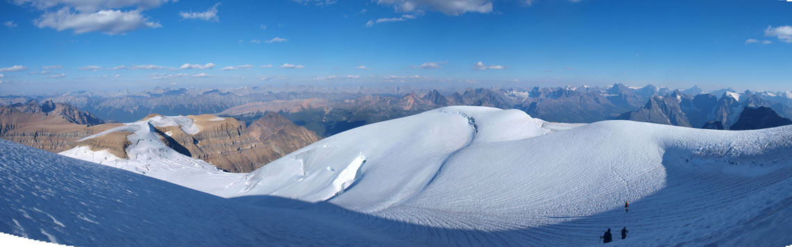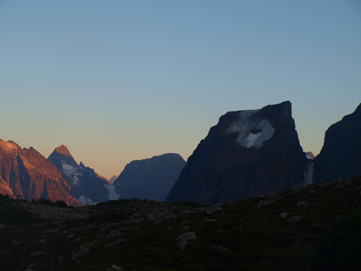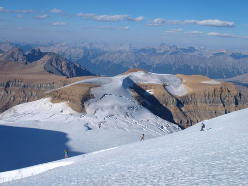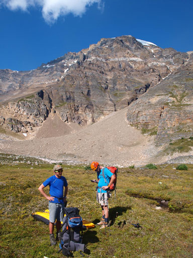 It was late in the day so we had to descend quickly. Nobody fell into a crevasse on the return and we were off the snow/ice quickly. As the sun lowering itself the smoke appeared to be dissipating and we got better and better views especially towards Mount Alberta and Mount Columbia. The descent went smoothly but tedious. Now what, time to enjoy this superb bivy site! We were cooking and eating dinner while watching evening glow on the distant Sir Winston Churchill Range peaks across a lovely alpine tarn!