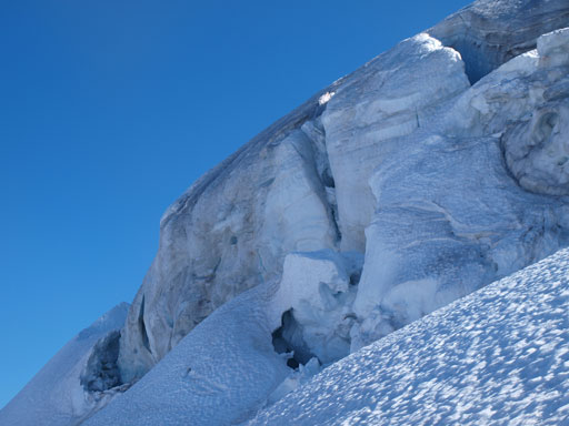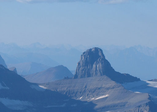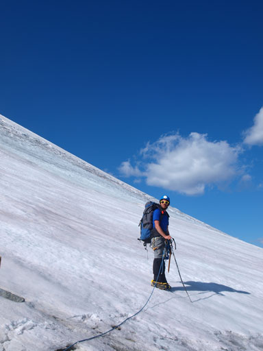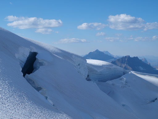 Less than 400 vertical meters to go. Liam led the way crossing a “handsome looking” crevasse before venturing onto the snow. The snow condition was much better than expected with pretty much negligible trail-breaking, but we realized this icefield/glacier was much more broken than we thought. It became pretty hopeless to see a large bergschrund/crevasse spanning most of the way across with the exception of the middle part that we couldn’t see. We contoured around a cool looking serac to the middle section of this glacier, and were very relieved to see easier terrain ahead. There were still numerous crevasses to cross but they were all bridged. Higher up we had to cross a big one that can suck in someone’s house. After that the summit was in sight but near the top we discovered a couple hidden crevasses including one right on the summit. We had to take turn to summit this mountain otherwise we’d be risking having more than 1 person falling into a hole. Despite the haze, the views were awesome. We could see many rarely seen peaks, as well as many familiar 11,000ers. The highest point was on snow and we thought about descending a bit to the rock so we could leave our register there, but doing so would involve another crevasse crossing and probably not really worth it.