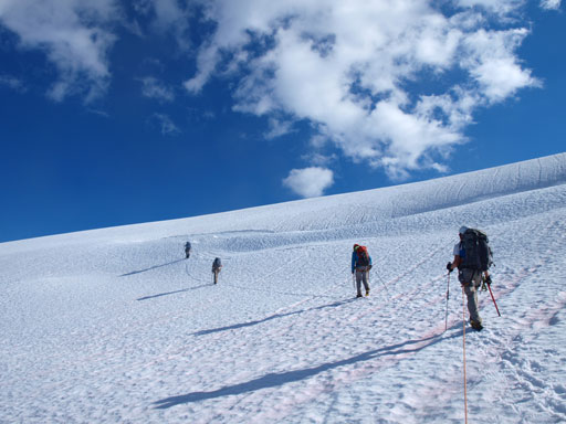 The south face looked to be very doable to us. Indeed, the scrambling never exceeded moderate on this route, though at times it got tedious and loose. We started on right side but worked our way towards left aiming for the long gully on far climber’s left. This gully would work all the way up from bottom to top but since we had five people we wanted to avoid rockfall zone for as much as we could. There’s a light grey band at about midway up and the only way to break through it was by going up this gully, and from there on, we stayed in this gully and automatically broke through the next rock band. At the last rock band guarding the summit ridge, again, the only break existed on far climber’s left. It took us about 2 hours from camp to the high shoulder. The glacier above us looked steep and broken. Our plan was to traverse around it on a big loop hoping to find easier route. We’d be on two rope teams with Liam, Eric, and Vern being the leading team, while Ben and I would stay behind on the 2nd rope.