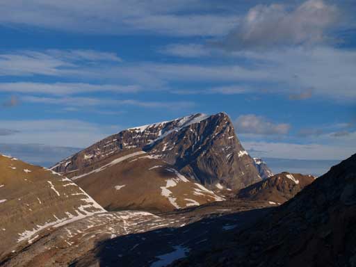 Like our earlier observation, this slope was a pure slog, especially considering our boots and the packs. From Kevin’s photo taken from Brazeau, we might need to do glacier travel between false and true summit so we decided to haul all the gears up. There’s not much to describe this slope except for patience and endurance. We aimed towards a distant snow patch, and after a long time we got closer to it, and apparently it’s quite sizable and offered some easy travelling. Not far up we gained the summit ridge and followed it to the false summit. It’s a long way up there.