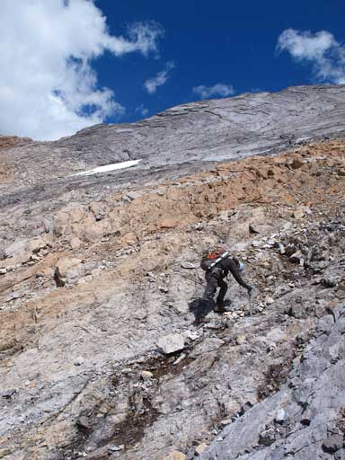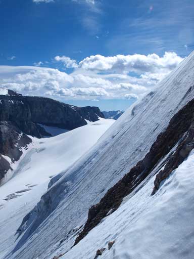 Kevin was more awake, but I slept over till almost 6 am in the morning before finally crawling out of my sleeping bag. We quickly geared up towards the high col north of Coronet Mountain. It took us much longer than expected and once there, we were pleased to see an alpine tarn that probably rarely sees visitors. Continuing up the moraine, we saw bad news. If we wanted to gain the north glacier, we had to climb up a vertical headwall followed by vertical ice. There’s no easy way up and we had to turn around. However, I’m glad we did this bit of diversion since the view looking back at that tarn was gorgeous. Behind is the impressive Mount Mary Vaux, which I believe is only an easy scramble. So we backtracked to the west slope.