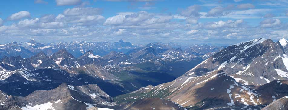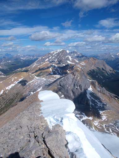 Indeed, there’s glacier between the two summits. However, I think we could stay on the rock edge if we wanted to, and that would be exposed difficult scrambling for a couple sections. It was still early in the day, and since we hauled up all the gears, we decided to use them. The snow looked to be much more fun than the rock. The climb was pretty easy actually, with a couple deep post-holing sections. But since I needed to get more experience we took our time practicing some basic techniques. The summit was actually a huge snow hump and we didn’t know if that’s a cornice or not. We used a solid rock on the summit as belay and we took turn gaining the actual high point. The views were, needless to say, awesome. With the Brazeau/Warren group being right in front of us, and the entire Sir Winston Churchill Range behind including the North Face of Mount Alberta, we felt very happy to be here.